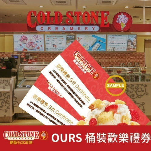 ● 憑本券可至COLD STONE任一直營門市兌換價值新台幣630元之OURS享樂桶經典冰淇淋(容量950ml)乙桶。