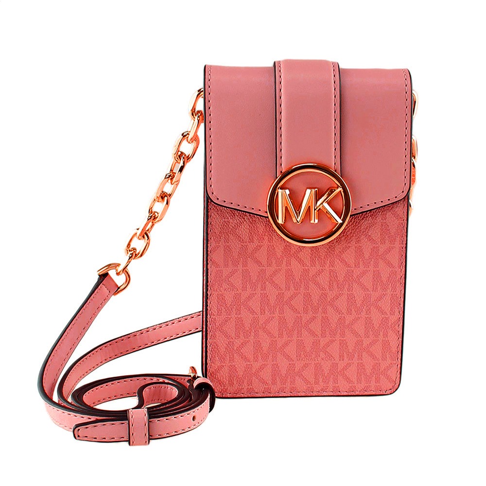 【MICHAEL KORS】滿版LOGO皮革手機斜背包-珊瑚色