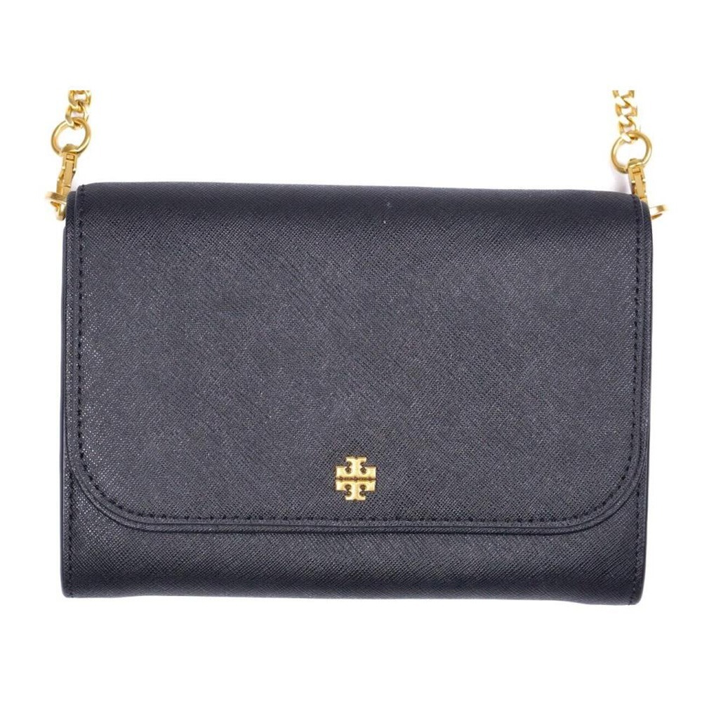 【TORY BURCH】十字紋防刮皮革掀蓋按釦斜背包-黑