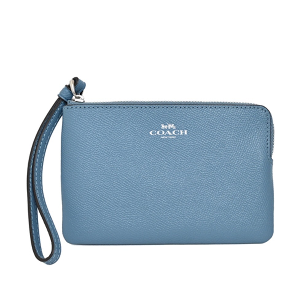 【COACH】素面皮革L型拉鍊手拿包-藍灰色
