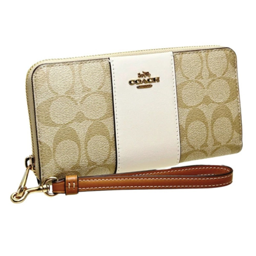 【COACH】滿版LOGO防刮皮革長夾-卡其白