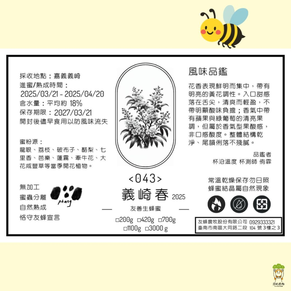 整體結構乾淨、尾韻俐落不殘膩,非常適合沖泡蜂蜜水與日常飲用,是一款清新取向的花香主導型春蜜。