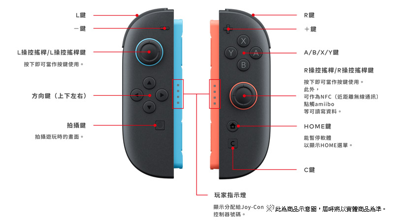 尺寸:11.6cm x 4.14cm x 3.07cm(從類比操控搖桿的前端至 ZL / ZR 突起部分的最大厚度)