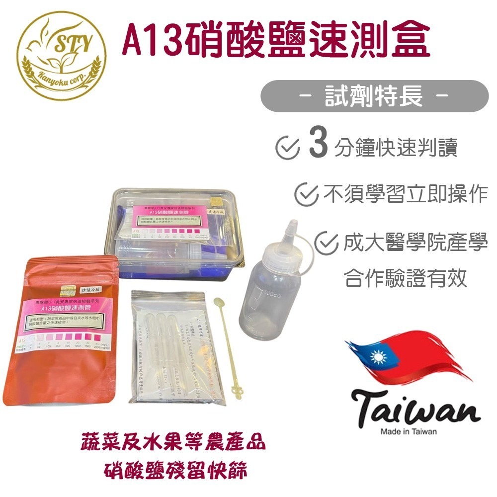 ◆ 品名:STY-A13食安專家硝酸鹽快篩盒(10/20/50次蔬果類食品硝酸鹽檢驗)