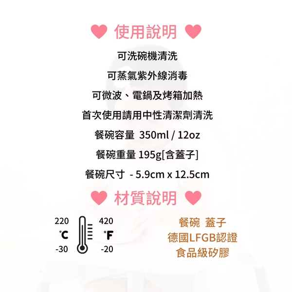 餐碗耐熱度:餐碗/蓋子:德國LFGB食品級矽膠-30℃至220℃