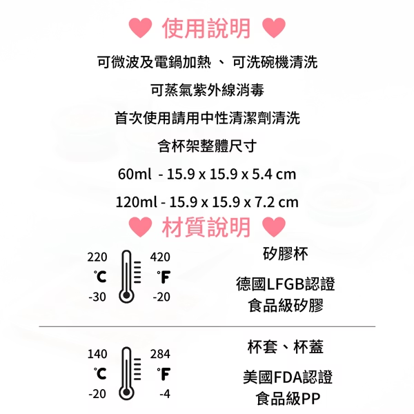 耐熱度: 杯身:德國LFGB食品級矽膠-30°C~220°C 杯套/杯蓋/杯架:食品級PP-20°C~110°C