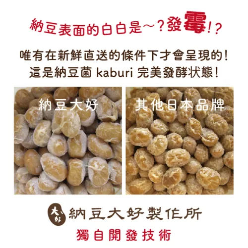 納豆的美味被日本人稱作第六味の”鮮味”,唯有在剛製作好不久的納豆才會有的鮮味。而在台灣市售的納豆,有效期限為一年在長時間的冷凍下,第六味的鮮味已蕩然無存~(日本國內的有效期為一週)“納豆大好製造所”就是為了能給台灣人提供正宗日本鮮美納豆味!而誕生!