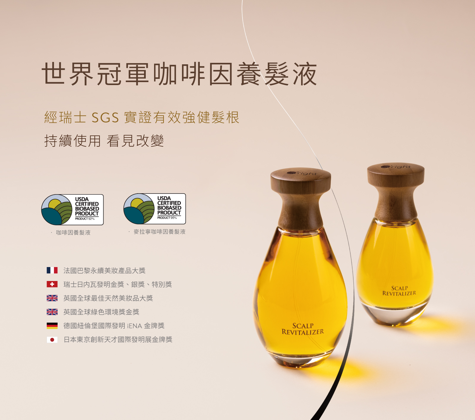 養髮功效通過SGS人體試驗實證(報告編號:JT00452023299956),以科學數據證明養髮功效: •強健髮根,活絡頭皮,不含西藥成分 •取自台灣原生咖啡,以超音波萃取完整保留活性 •成分獲獨家 INCI 命名權,被認證的創新研發成果 •榮獲美國官方 USDA Biobased 天然永續產品 •獨家「麥拉寧」萃取,高效抵禦老化因子
