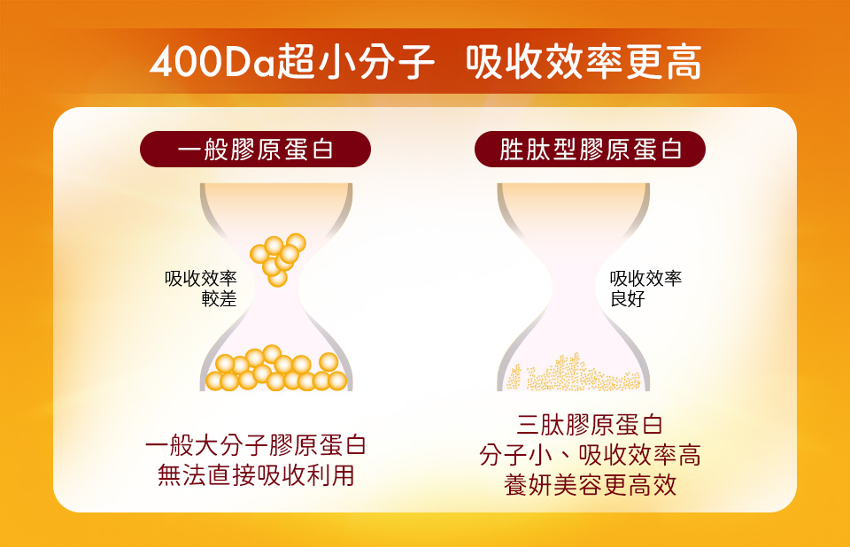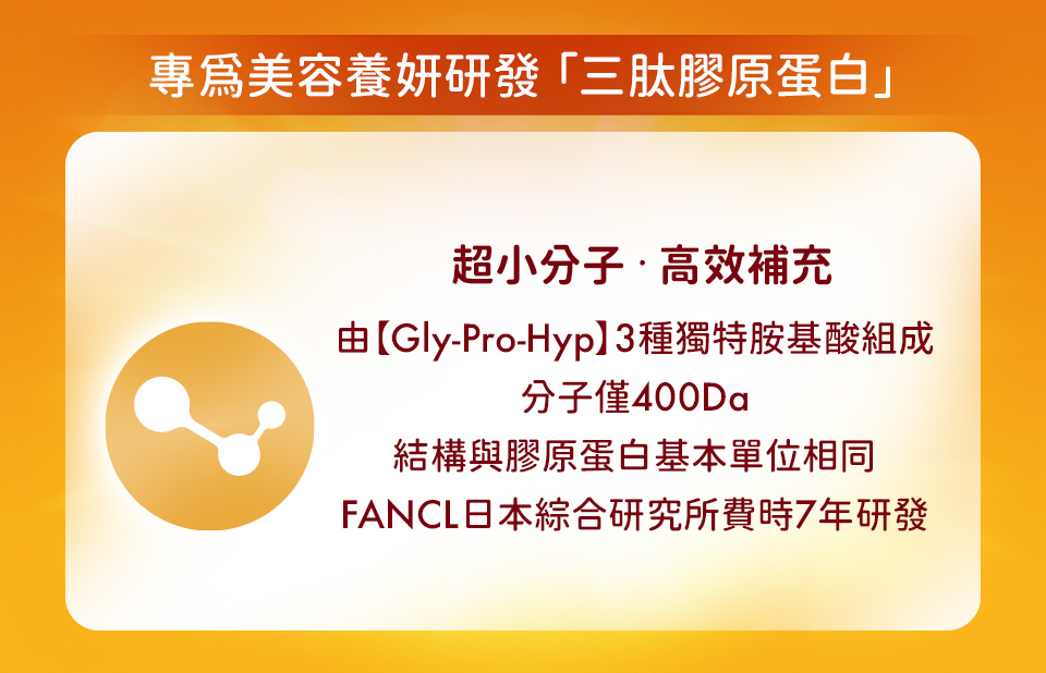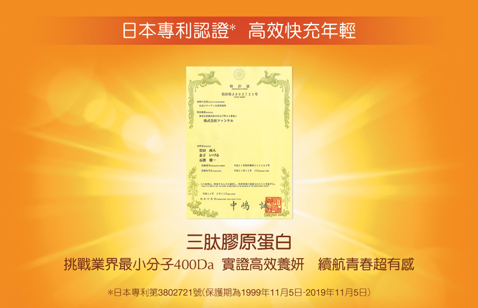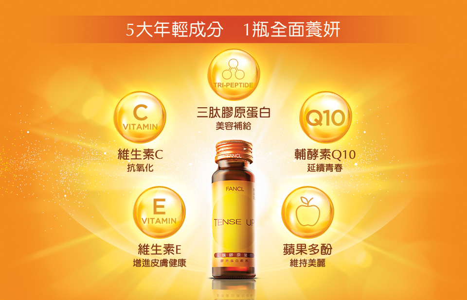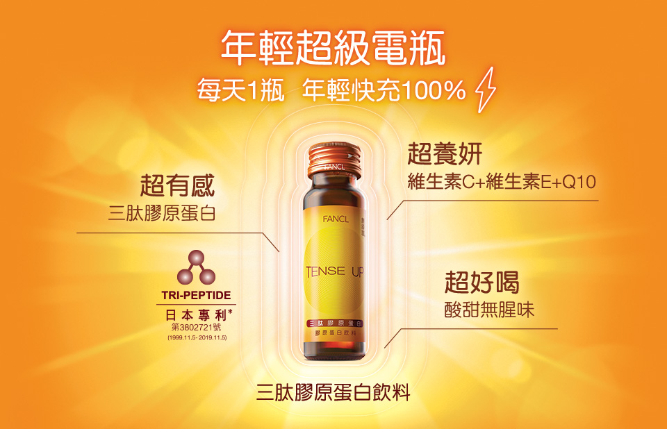 專利「三肽膠原蛋白」,分子極細,極易被吸收。一次補充維生素C、維生素E與Q10等美容關鍵營養,回彈年輕美麗。