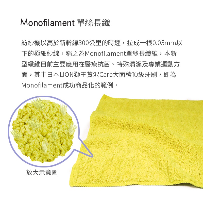 使 用Mono長纖與MicroFiber+極超細纖維交叉混紡,其中Mono纖維如同微米級掃把般,輕易勾附細小灰塵及毛髮,去汙力大幅提升。