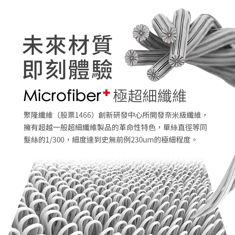 MicroFiber +極超細纖維材質經嚴謹製程,以絕佳觸感以及不易脫紗、不會掉屑且抗拉扯的長纖維特性,可滿足長年或重度使用的環境。