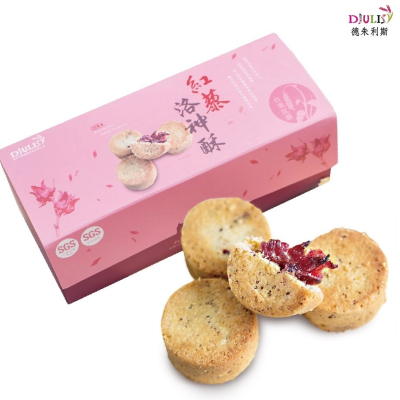 成份:洛神果餡(冬瓜、鳳梨、洛神、麥芽、砂糖、鹽)、麵粉、奶油、烤酥油(無水奶油、棕櫚油、抗氧化劑-維生素E(混合濃縮生育醇、芥花油)、香料、著色劑-玉米油.β胡蘿蔔素)、雞蛋、糖粉、奶粉、台東紅藜(去殼)、芝士粉