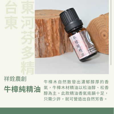 牛樟木自然散發出濃郁醇厚的香氣,牛樟木材精油以松油醇、松香醇為主。此款精油香氣底韻十足,只需少許,就可營造出自然芳香。