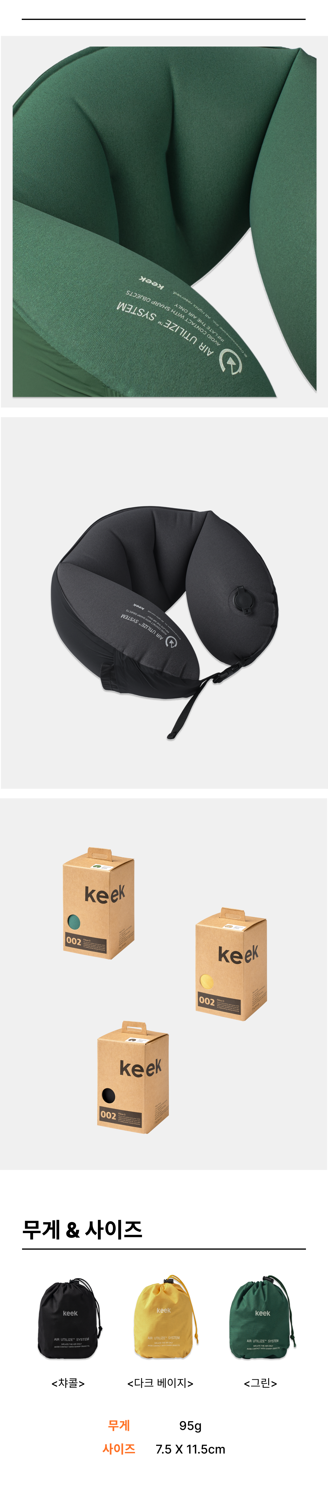 🔺產品說明➡️ 以Pillowdy開發技術經驗爲基礎誕生的"空氣頸枕"。通過無數次測試,雖然是95g的超輕重量,但為了能够舒服地休息,以人體工學3D設計開發,接觸皮膚的部分使用柔軟材質,不會產生沙沙聲響,彈性卓越, 能從汗水或油分中保持舒適感。 內飾材質以Air爲材料,是環保且半永久性、透射度爲0的自研專利面料,不會漏氣或透溼,單獨蓋上無需分離,可利用洗衣機簡便洗滌,不使用時,放置於收納袋中保管且方便攜帶。 * 建議充氣後按照個人頸部形態調整使用