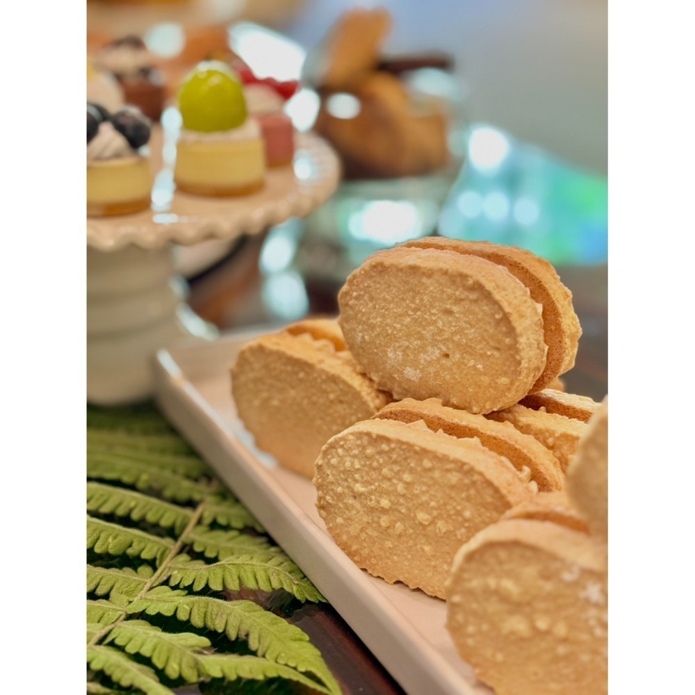 達克瓦茲是混合糖蛋白跟杏仁粉高溫烘烤而成,內夾奶油混和義式蛋白霜,再點綴浸泡蘭姆酒的葡萄乾