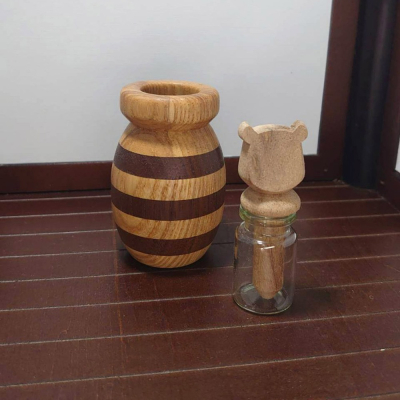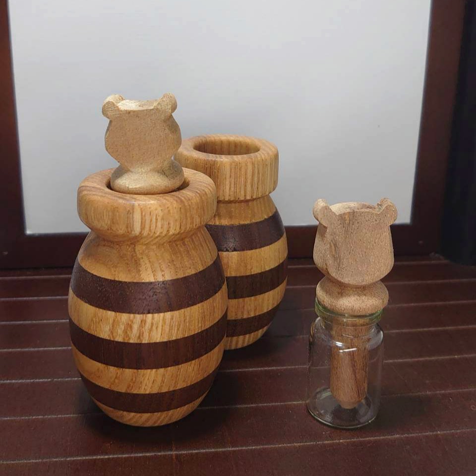 每一組有三件配件:小熊造型木棒、玻璃瓶、木作車床蜂蜜罐