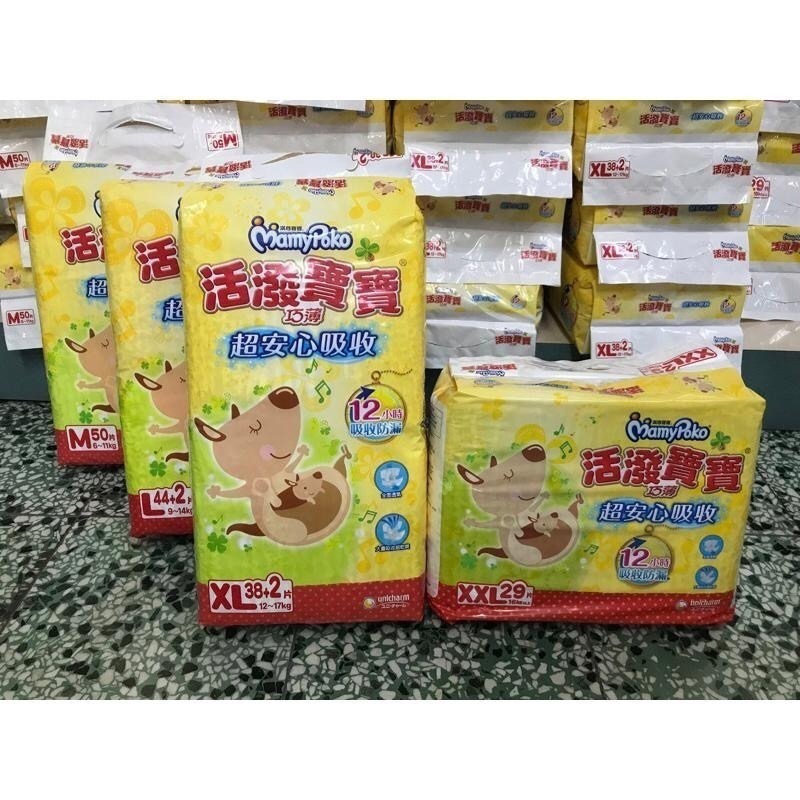 📢~超商取貨最多2包 商品特色: ●超安心吸收,12小時吸收防漏 ●彈力腰圍透氣孔,流汗再多也不易悶熱 ●瞬間透氣外層,迅速排出屁屁的熱氣 ●材質柔軟的防漏側邊,讓大腿無勒痕,還能防止外漏 ●可愛對齊線設計 建議尺寸: M 6~11kg L 9~14kg XL 12~17kg XXL 16kg以上 【商品規格】※本商品為『黏貼型』尿布 L (44+2片/包) XL (38+2片/包) XXL(29片/包) 原產地:台灣(L/XL)、泰國(XXL) 保存期限 : 36個月 有效期限 : 每批更新,依商品外包裝所示 貨源:官方授權公司貨 材質:PE,PET,PP不織布,棉狀紙漿