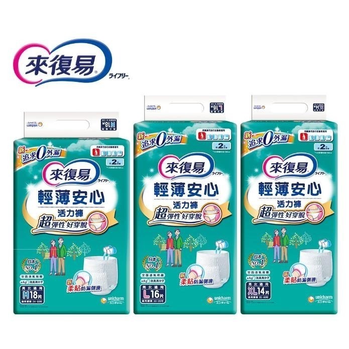 【商品特色】 📢~~超商限1單2包,超過2包請選宅配!!!!! 宅配一單限8包!!!! 【來復易】 輕薄安心活力褲 (M / L / XL) (褲型尿布/成人紙尿褲) 《內褲型-外側用紙尿褲-可自行走動》 適用於可自行走動者 超彈性腰圍 薄型強效吸收體 添加除臭高分子 全面透氣背層 加高立體防漏側 【商品規格】 ●M(18片/包) ●L(16片/包) ●XL(14片/包) 產地:泰國 保存期限 : 3年 有效期限 : 每批更新,依商品外包裝所示 貨源:官方授權公司貨 保存方法:請放置於陰涼乾燥處,並避免高溫及陽光直射 材質: 1.表面材:聚烯烴、聚酯不織布 2.吸水材:棉狀紙漿、吸水紙、高分子吸收體 3.防水外層:聚烯烴膠膜 4.伸縮材:聚氨酯 5.綜合材:苯乙烯系彈性體合成樹脂