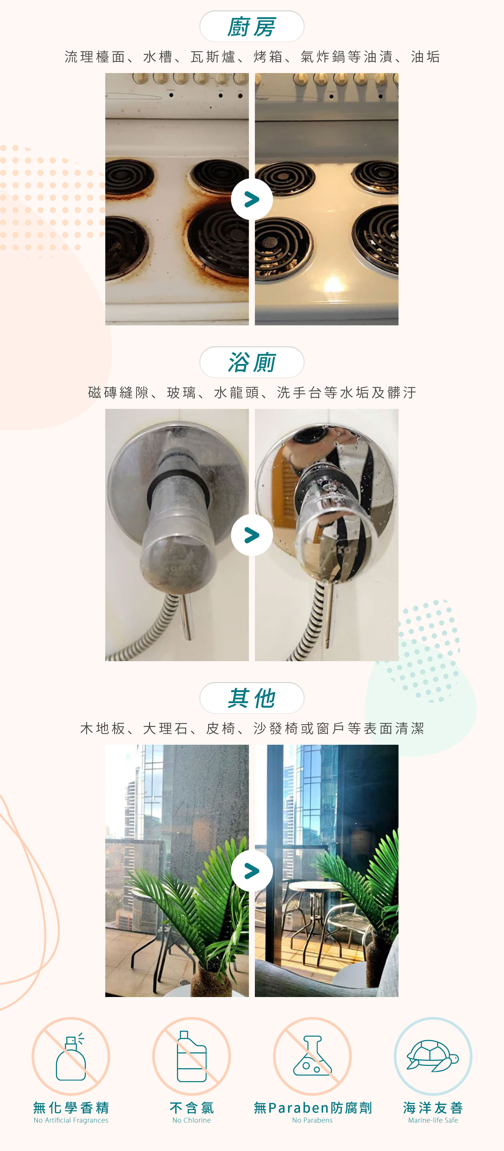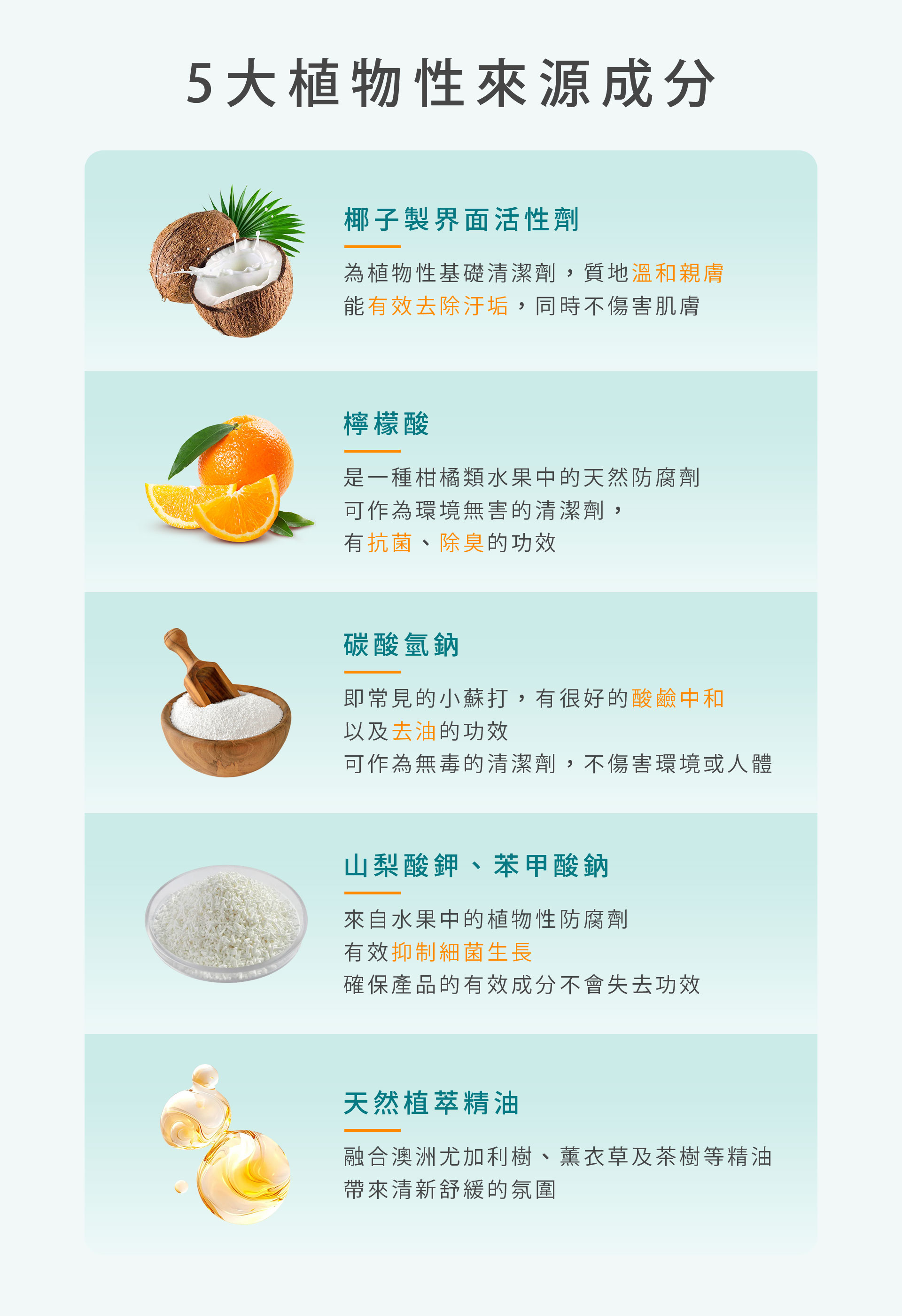 • 天然除汙成份、不含合成香精、無刺激性化學溶劑
