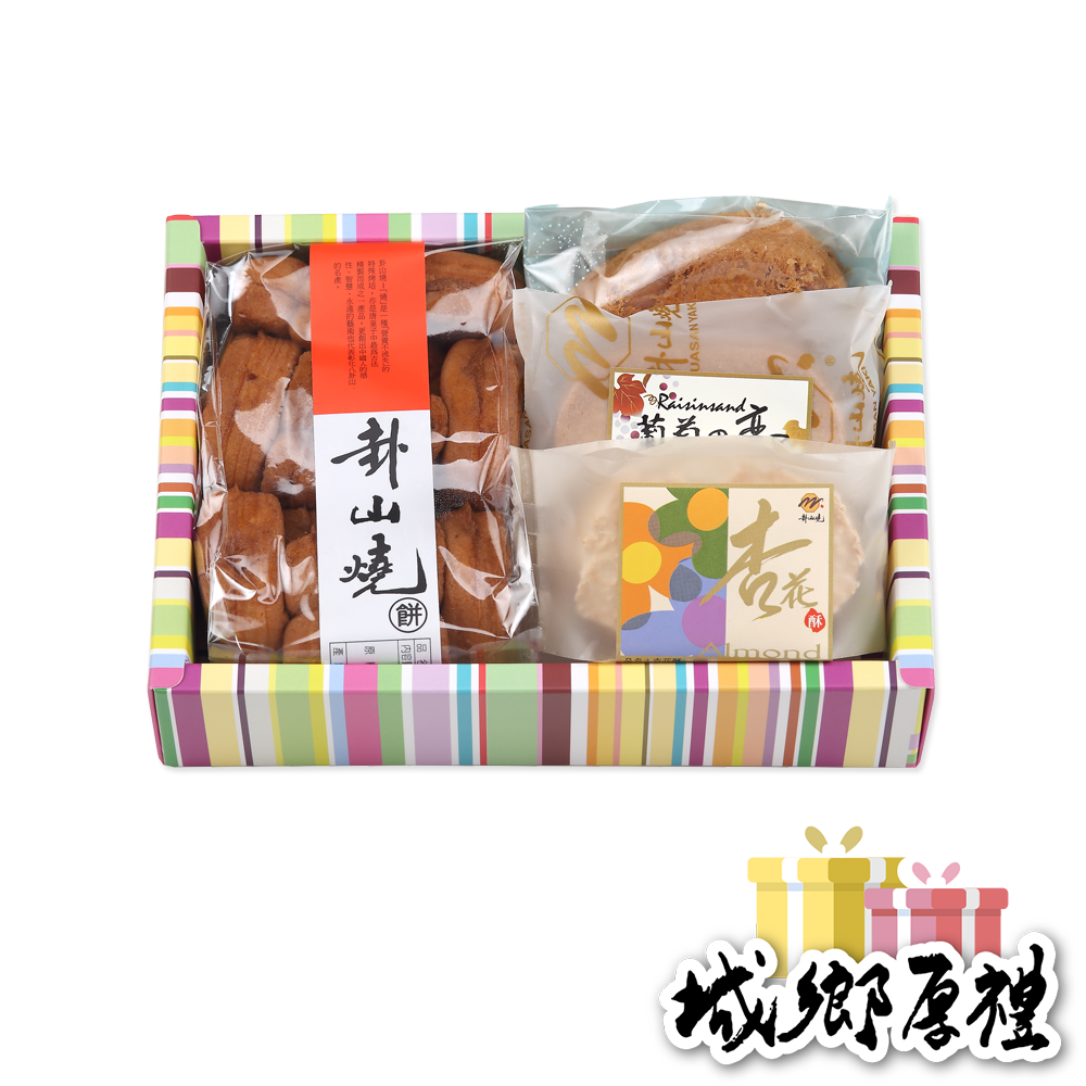 禮盒內容物 : 葡萄之戀*1, 卦山燒餅(8入)*1(口味隨機出貨) , 喀禮多厚燒*1 ,杏花酥*1。