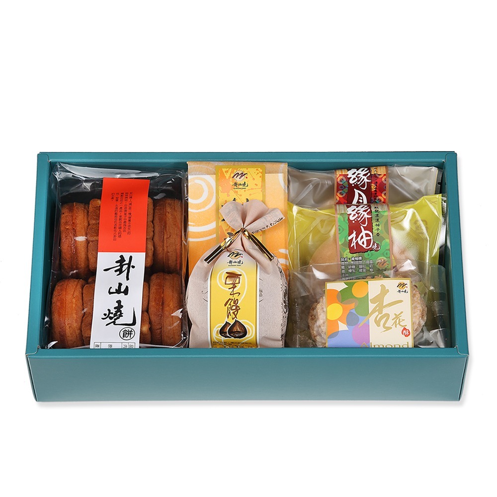 禮盒內容物 :卦山燒餅(8入,口味隨機出貨)*1 ,杏花酥*1 , 桔福*1 , 栗饅*1 , 緣月(柚)燒*2 。
