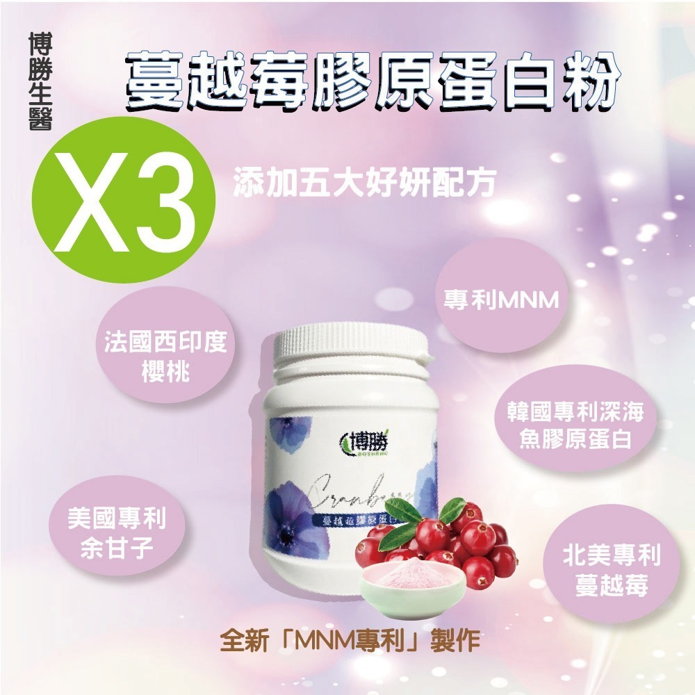 成分:專利三胜肽水解膠原蛋白粉、蔓越莓果汁粉(砂糖、麥芽糊精、蔓越莓濃縮汁、檸檬酸、檸檬酸鈉、香料、紅甜菜汁、婀娜多色素、栀子藍色素)