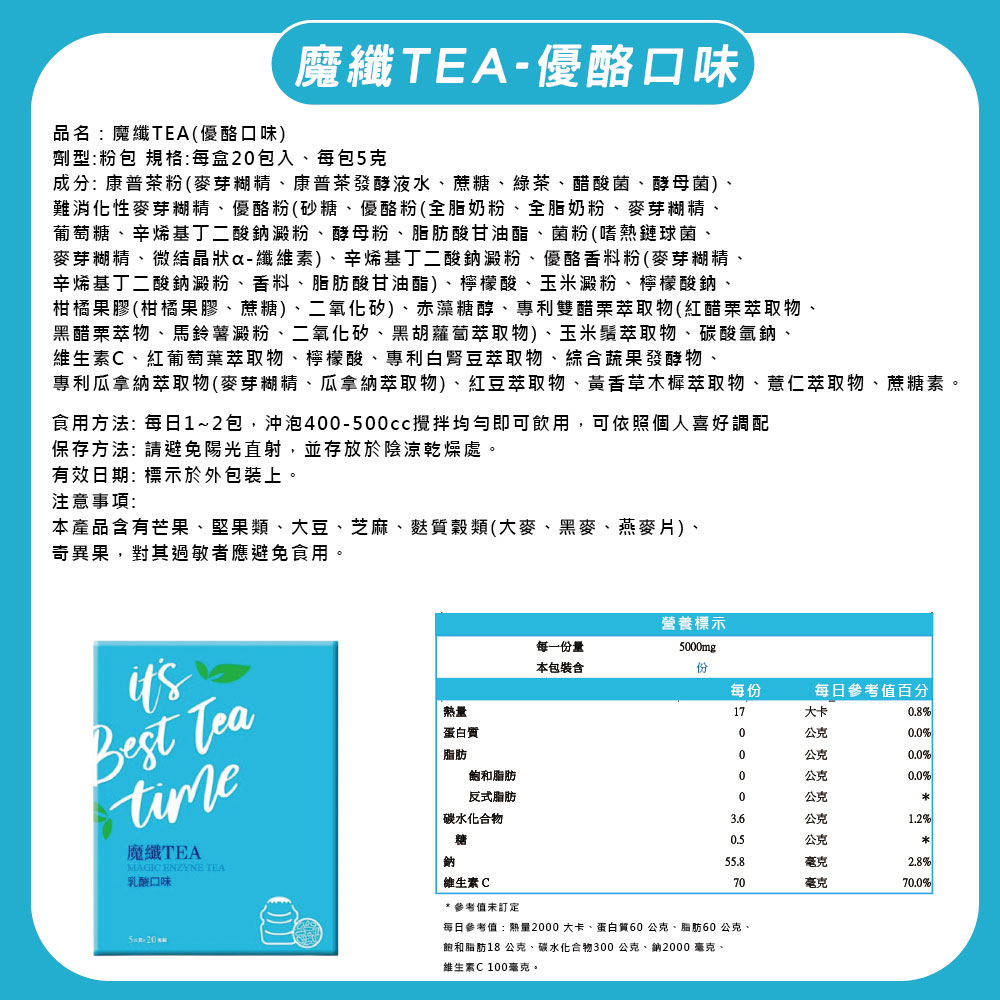 【博勝生醫】 魔纖TEA康普茶 (優酪口味) 盒/20包 (順暢代謝/專利白腎豆/專利瓜拿納萃取)
