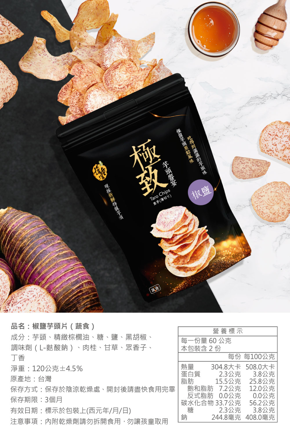 嚴選在地跳石地區新鮮芋頭切片而成,胡椒與海鹽的組合,您可以試吃一片,會有種似曾相似的味道。