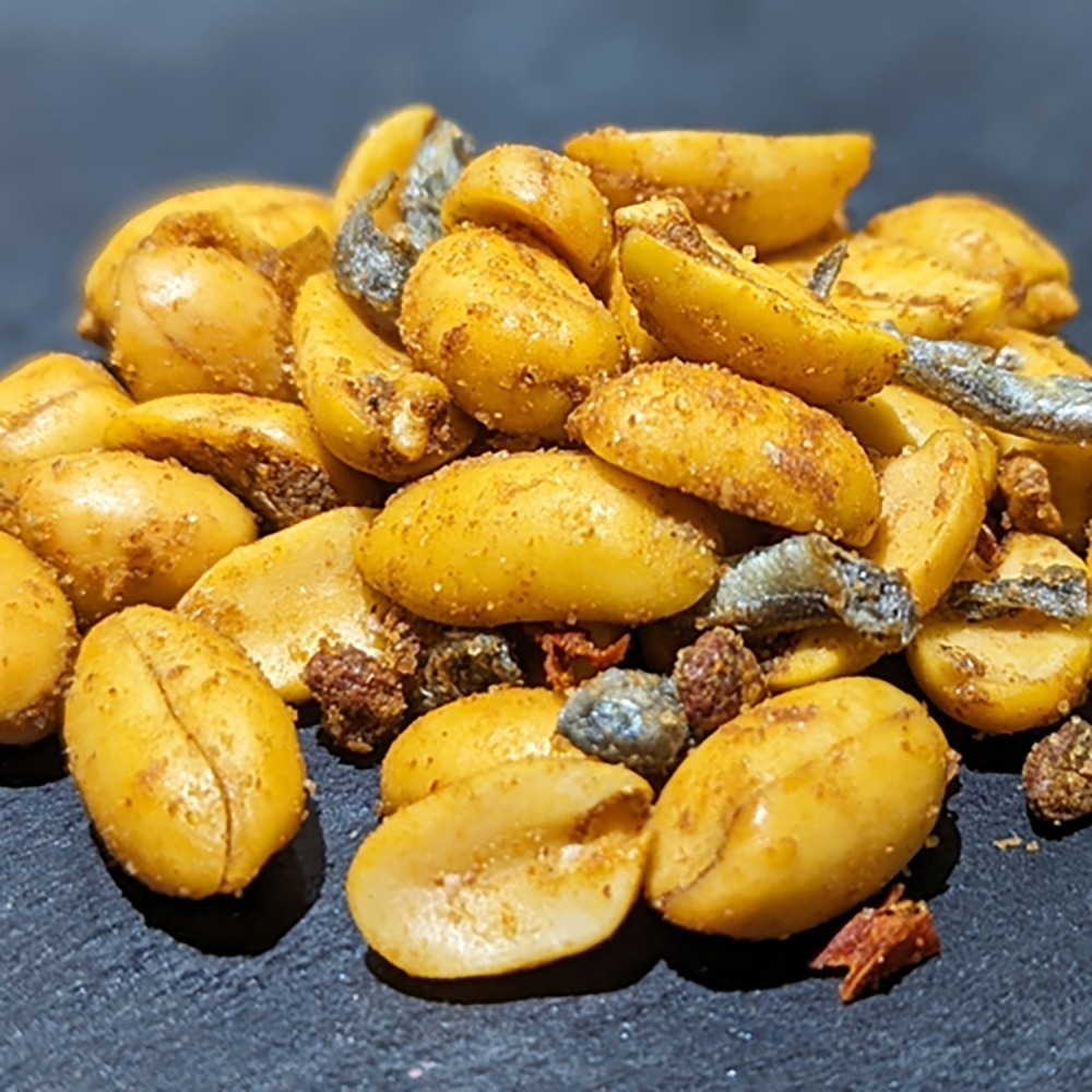 成分:花生、小魚乾[小魚、糖、海樂糖、混合濃縮生育醇(抗氧化劑)]、花椒粒、辣椒粉、辣椒、精鹽、花椒粉、L-麩酸鈉(調味劑)、棕櫚油。