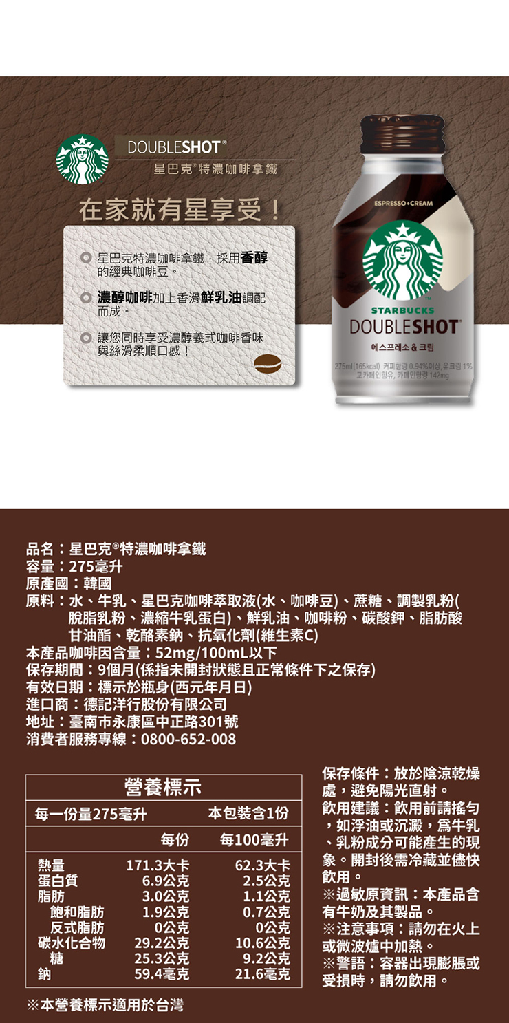 【家購網嚴選】STARBUCKS 星巴克 特濃咖啡拿鐵 275ml/瓶