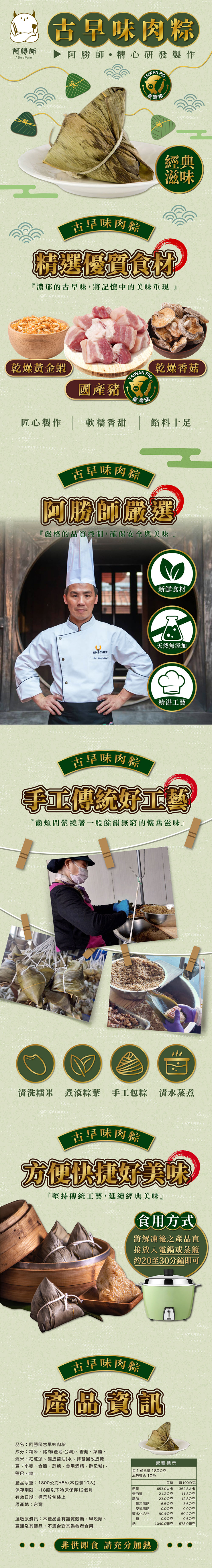 成分:糯米、豬肉(產地:台灣)、香菇、菜脯、蝦米、紅蔥頭、釀造醬油(水、非基因改造黃豆、小麥、食鹽、蔗糖、食用酒精、酵母粉)、鹽巴、糖