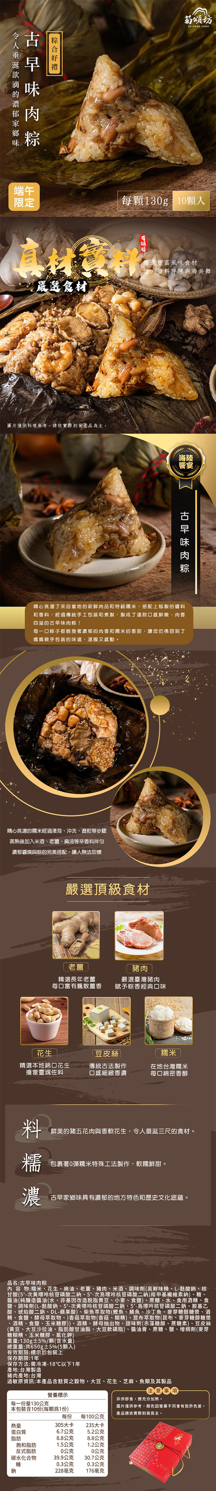成份:糯米、豬肉、花生、麻油、老薑、米酒、調味劑、(高鮮味精、L-麩酸鈉)、核甘酸(5'-次黃嘌呤核苷磷酸二鈉、5'-鳥嘌呤核苷磷酸二鈉)羧甲基纖維素鈉、糖、醬油、酒精、酵母抽取物、甜味劑、豆皮絲、醬油膏、蔗糖、鹽、增稠劑