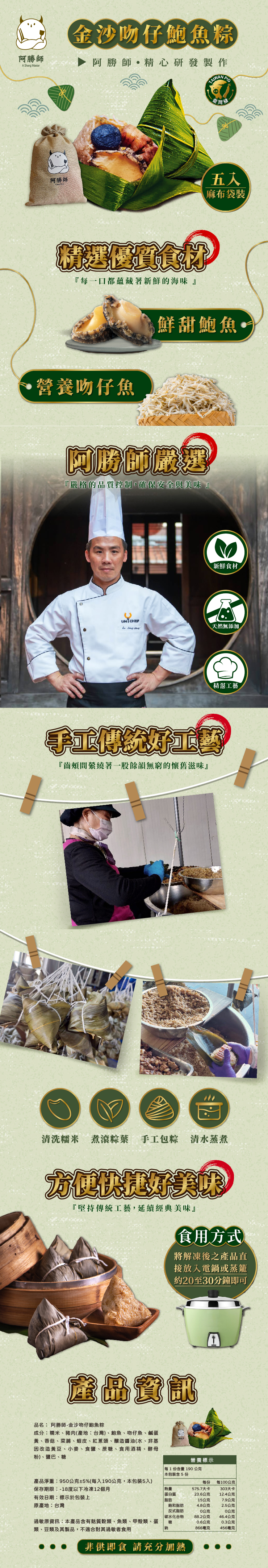 成分:糯米、豬肉(產地:台灣)、鮑魚、吻仔魚、鹹蛋黃、香菇、菜脯、蝦皮、紅蔥頭、釀造醬油(水、非基因改造黃豆、小麥、食鹽、蔗糖、食用酒精、酵母粉)、鹽巴、糖