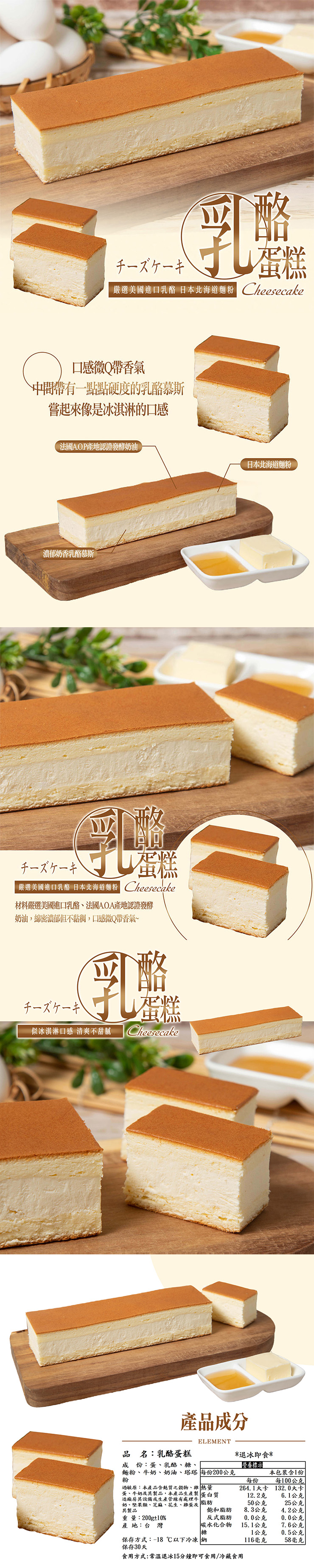成份:蛋、乳酪、糖、麵粉、牛奶、奶油、烘焙粉