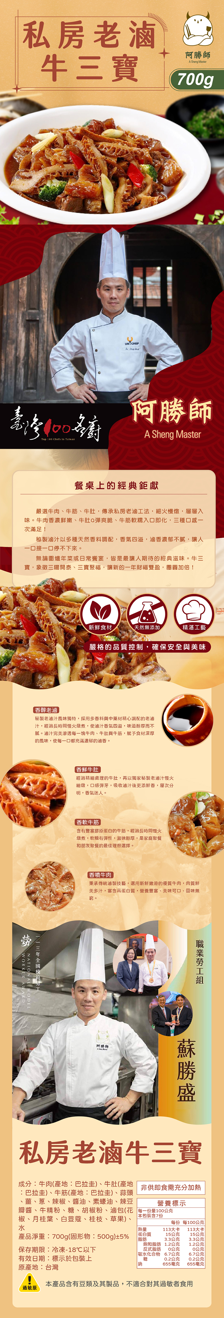阿勝師私房老滷牛三寶,嚴選上等牛肚、牛筋與牛腱,以獨門老滷湯頭細火慢燉,保留食材Q彈口感與濃郁香氣。
