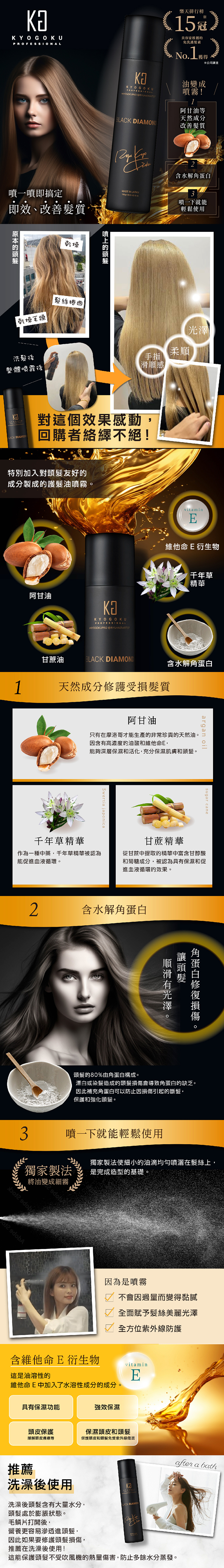 【KYOGOKU 黑鑽石髮油噴霧】日本專業級護髮噴霧,專為染燙受損、毛躁乾枯髮質設計。