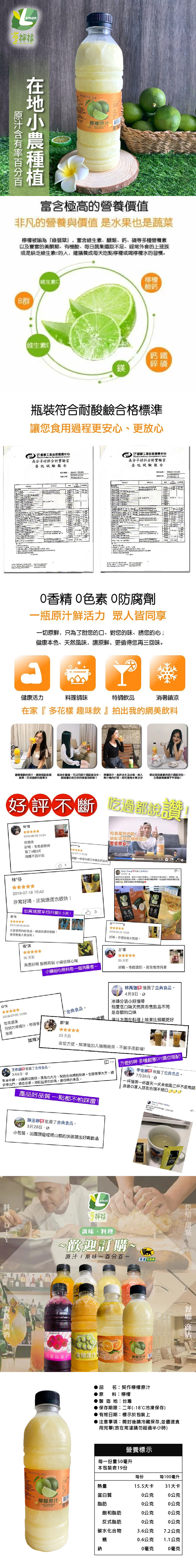 營養標示(每100毫升):熱量31大卡、蛋白質0克、脂肪0克、飽和脂肪0克、反式脂肪0克、碳水化合物7.2克、糖1.1克、鈉0毫克