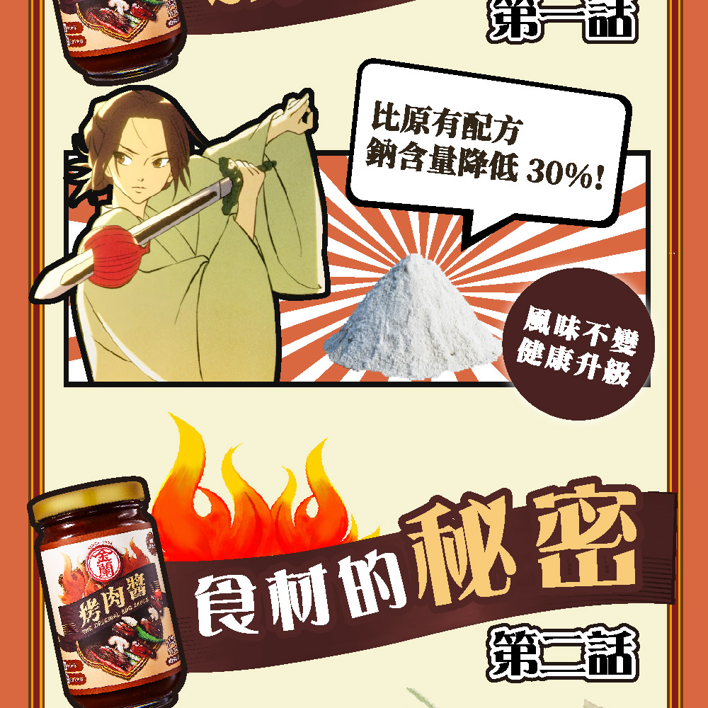內容物:水、轉化液糖(蔗糖、水)、釀造生醬油(非基因改造脫脂黃豆片、小麥、食鹽、水)、特級砂糖、蒜粒、粘稠劑(乙醯化己二酸二澱粉、玉米糖膠)、辣椒醬(辣椒、食鹽、水)、調味劑(L-麩酸鈉、DL-蘋果酸、檸檬酸)、湖鹽、芝麻粉、肉桂粉、薑母粉、白胡椒粉、甜味劑(甘草萃(含糊精、檸檬酸鈉)、甜菊醣苷)、八角粉、酵母抽出物、紅麴色素(含酒精)、眾香子粉。