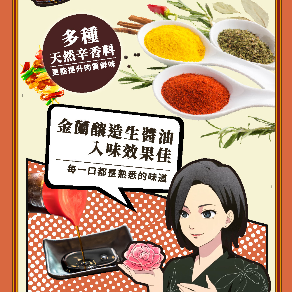 ◌純釀造醬汁,添加各式綜合香辛料,入味效果好,提升肉質的鮮味