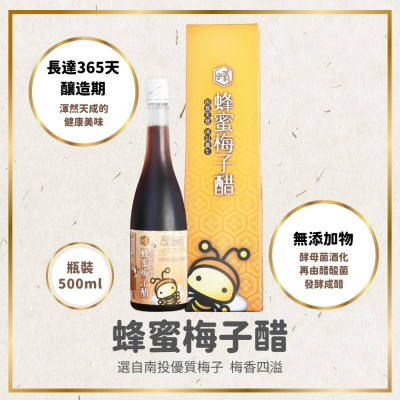 經由中寮得天獨厚的天然環境採集而成的純蜂蜜製成的蜂蜜醋,加上高海拔地區所生產的優質7分熟青梅,以傳統工法為期二年的醞釀,釀出一瓶年產量相當有限的蜂蜜梅子醋。 造就了美味與健康的自然風味。