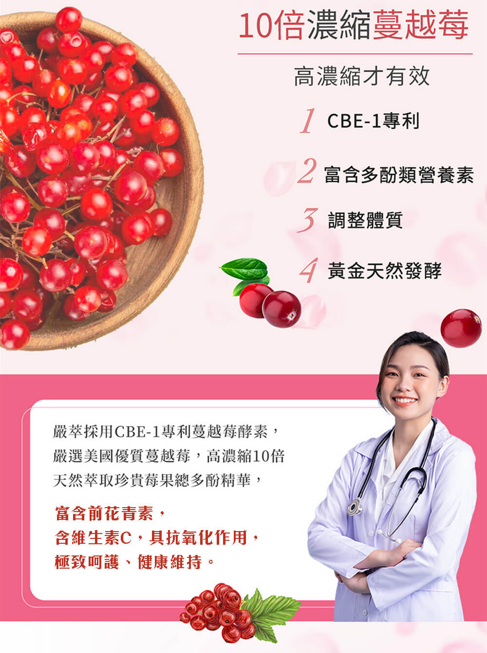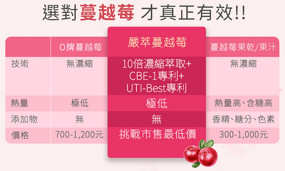 ✔專利CBE-1,超高濃縮 10 倍天然萃取,嚴選自美國優質蔓越莓,適合女性調整體質