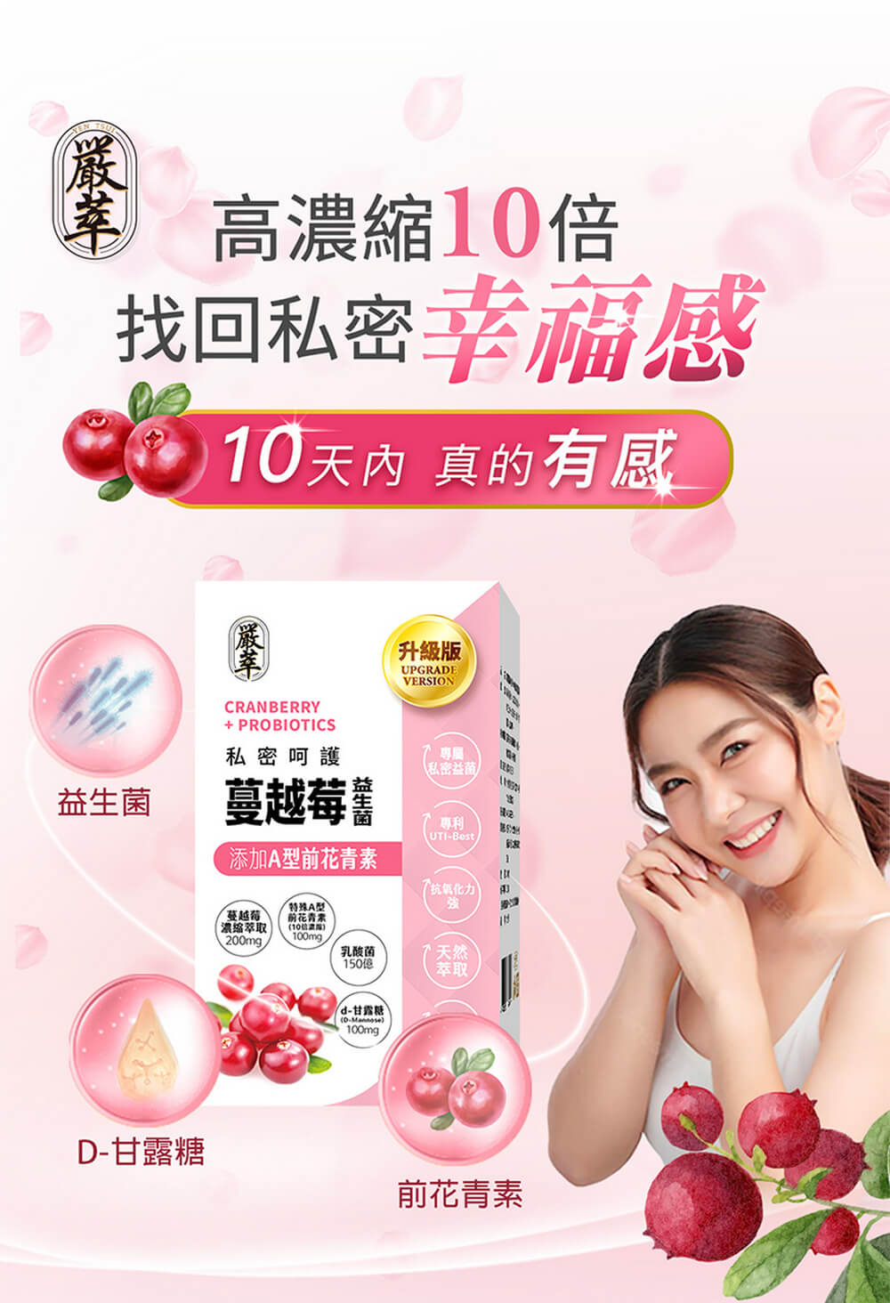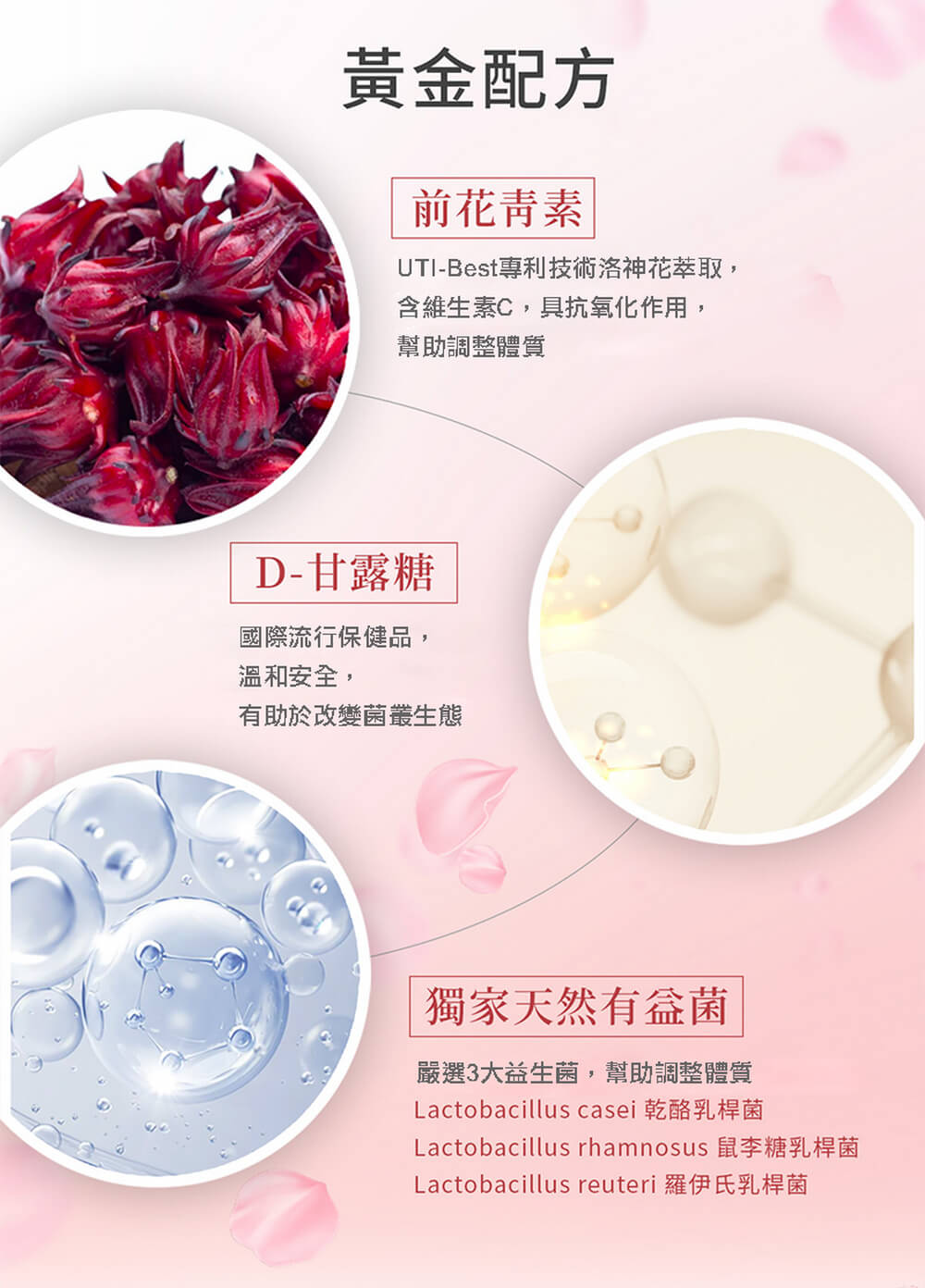 1.私密呵護黃金配方-高濃度蔓越莓 x 特殊A型前花青素 x D-甘露糖 x 3大益生菌