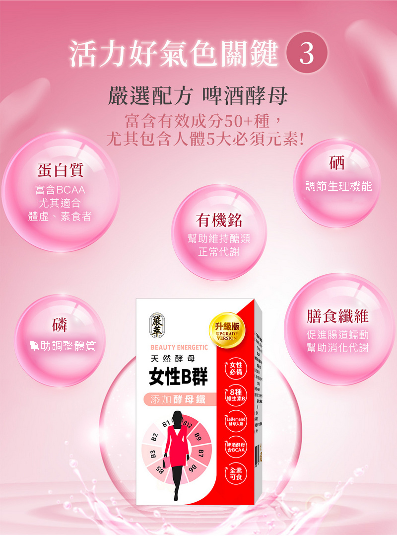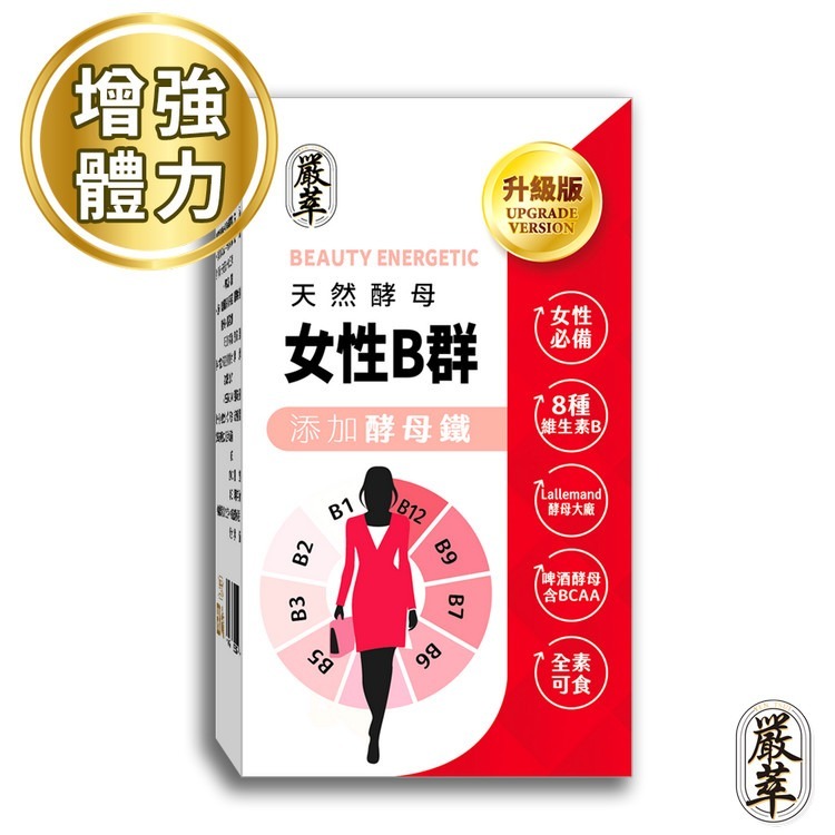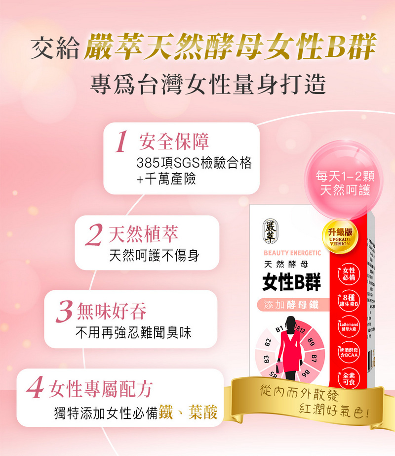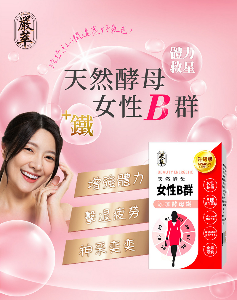 A:嚴粹的【女性B群+鐵】含量比市面高,而且採用高成本天然酵母,非市面上常見的合成B群