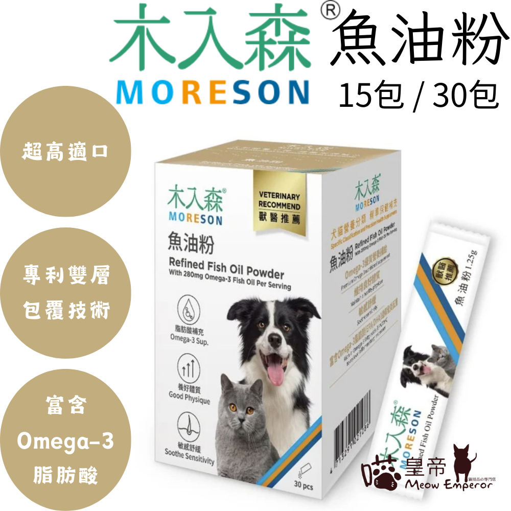 商品名稱木入森犬貓寵物魚油粉主要成分專利雙層包覆魚油粉(精製魚油、魚膠、維生素C、維生素E、葵花油、檸檬酸)內容量1.25公克/包;30包/盒食用方式無添加,健康純粹無腥味,可直接給犬貓食用或混合飼料食用。貓咪數量建議小於4kg:半包/日