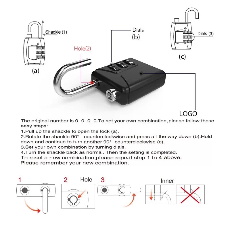 原始數字是0-0-0。 要設定您自己的密碼,請按照以下簡單步驟: