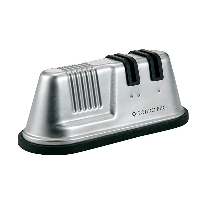 藤次郎 PRO 磨刀器有粗磨石(#320)和中磨石(#1000)兩種磨刀石,便於日常維護。主體採用18-8不銹鋼,商用耐用性極佳。底部由防滑彈性體樹脂製成。之後打開底部可以更換磨損的磨刀石。 材質: 磨石:陶瓷輪 外身:18-8 不銹鋼 尺寸:總長度約:205 x 75 x 75 mm 重量:約290g