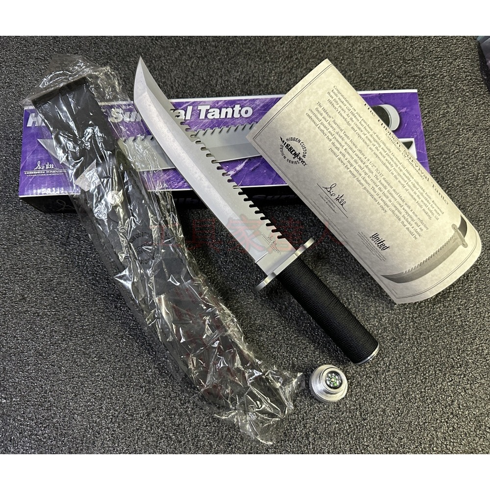 此款獵刀為國際知名刀匠“GIL HIBBEN”所設計,UNITED刀廠所生產,藍波刀外型設計,厚實的刀身為鋒利的7Cr17不銹鋼刀片,經消光噴砂處理,刀背雙鋸齒設計,具堅固的刀鍔,金屬握柄纏黑繩,握感極佳,握柄為空心設計,內部可放小物品,尾端具尾蓋設計,可當羅盤使用,附壓印LOGO皮革刀套。