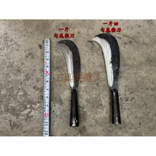 一斤勾尾柴刀:勾尾刃長:3.5cm 刀身刃長:16cm 厚度約:0.8cm 全長:34cm 重量:600g(±80)