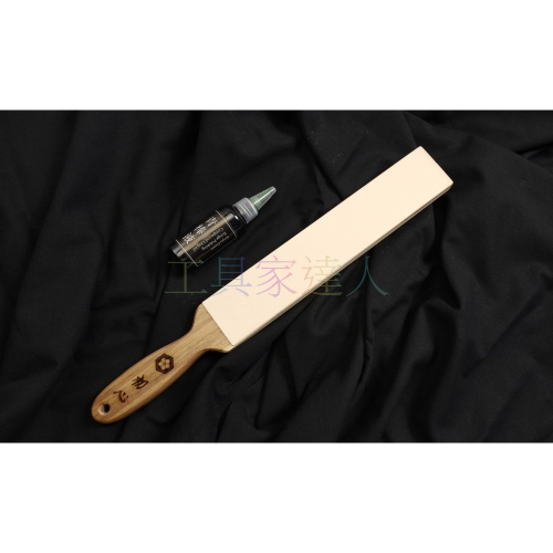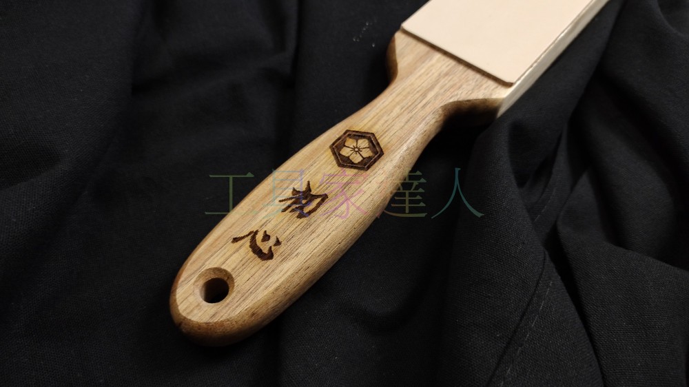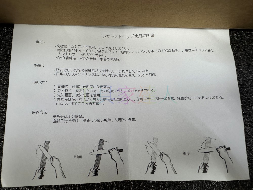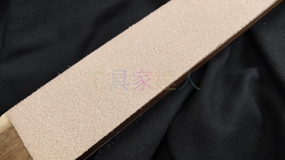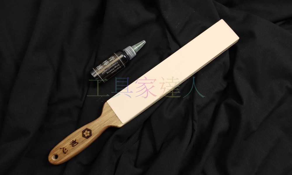 即使使用仕上砥石進行精磨,也很難去除細小的毛刺。在這種情況下,正是這種皮革磨料證明了其真正的價值。將刀刃用在以塗上青棒液革砥上並滑動以去除甚至無法用磨石去除的最細的毛刺,使其具有光滑的表面效果。通過應用附帶的青棒液(拋光材料)對背面皮革進行拋光,最後對正面皮革進行拋光。它是那些尋求可以長時間切割的最佳清晰度的工具,可以維持刀的最佳狀況。