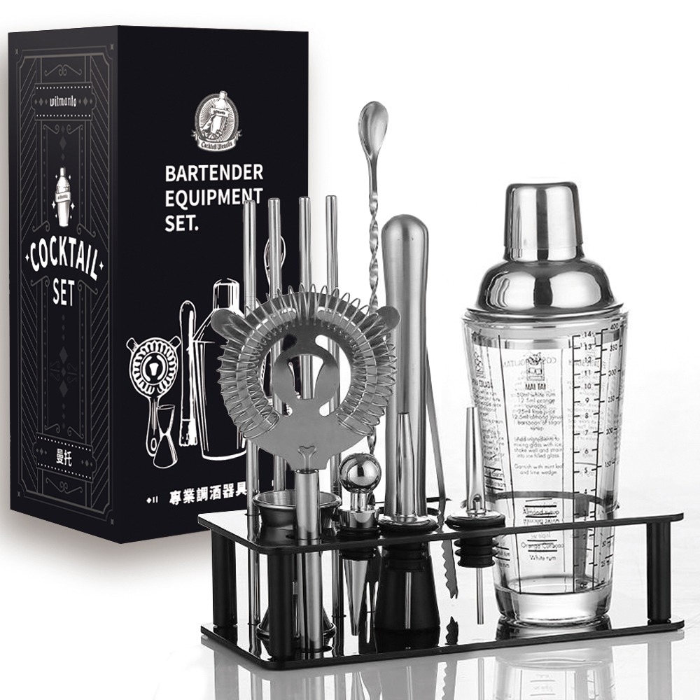 20件組 304、430、201食品級不銹鋼 ※ 內容物: 玻璃調酒器(400ml) x1、 酒嘴 x2、 酒針x2、 酒塞 x1、 酒嘴帽 x2、 搗冰錘 x1、 調酒棒 x1、 冰塊夾 x1、 濾冰器 x1、 吸管刷 x1、 檸檬刨絲器 x1、 不鏽鋼吸管 x4、 量杯15ml/30ml x1、 鋼琴ABS底座 x1 以上共20件